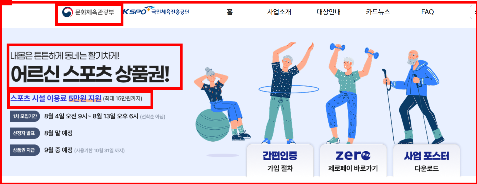 시니어 어르신 스포츠 상품권은 제로페이 모바일 상품권으로 지급됩니다. 신청은 국민체육진흥공단 어르신 스포츠상품권 전용 누리집에서 신청하실 수 있습니다. 1차 신청기한은 8월 13일까지이며, 2차 신청은 9월 중 예정입니다. 신청은 선착순이 아니기 때문에 날짜에 맞춰서 신청만 하시면 쉽게 받으실 수 있습니다.