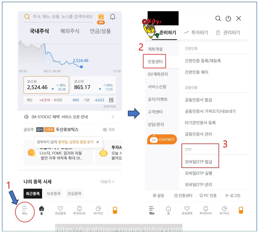1. 미래에셋증권 모바일 OTP : 앱 접속 → 마이페이지