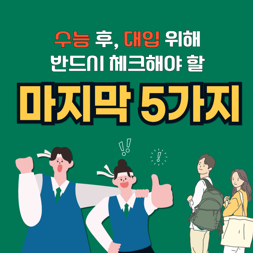수능을 잘 본 학생도, 예상보다 아쉬운 학생도 지금부터 어떤 판단을 하느냐에 따라 결과는 달라집니다. 대입은 속도보다 방향이 중요합니다. 한 번 결정할 때마다 합격 확률이 높아진다면, 그 방향이 바로 올바른 선택입니다. 다음 다섯 가지 항목을 꼭 체크하세요.