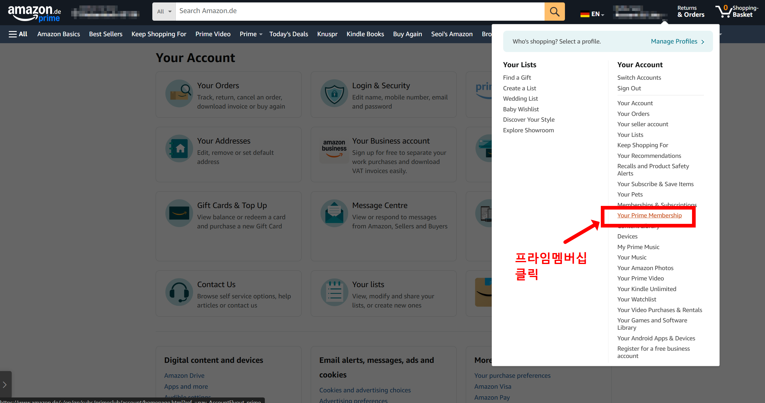 - 우측 상단 ‘Account & Lists’ → ‘Prime Membership’ 클릭