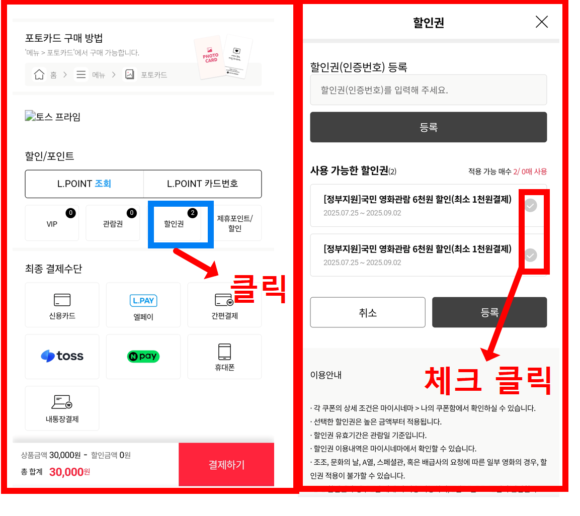 여러분이 영화 예매하기를 누르셨다면 할인권을 클릭하시면 됩니다. 전국민 영화보기 할인쿠폰을 눌러 자동으로 발급된 할인권이 저장되어 있습니다. 만약 할인권에 항목이 보이지 않는다면 영화관 메인페이지에서 전국민 영화쿠폰을 다시 클릭해서 발급을 시도하세요. 할인권 항목을 영화 매수에 맞게 체크한 후 등록을 누르면 완료입니다.