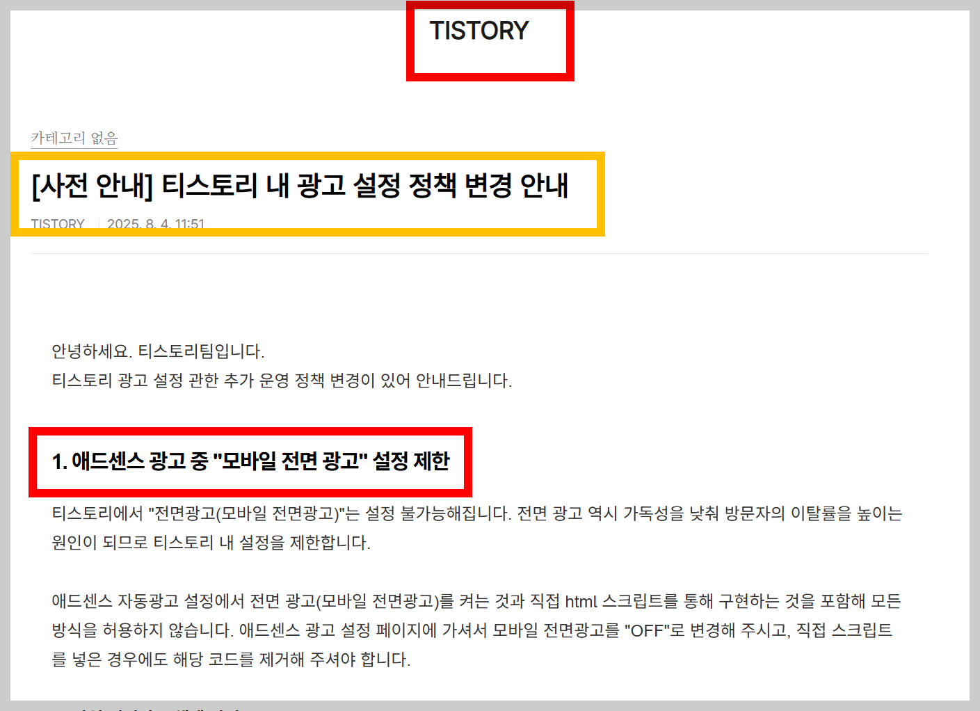 1. 티스토리 전면광고, 드디어 제한 시작
