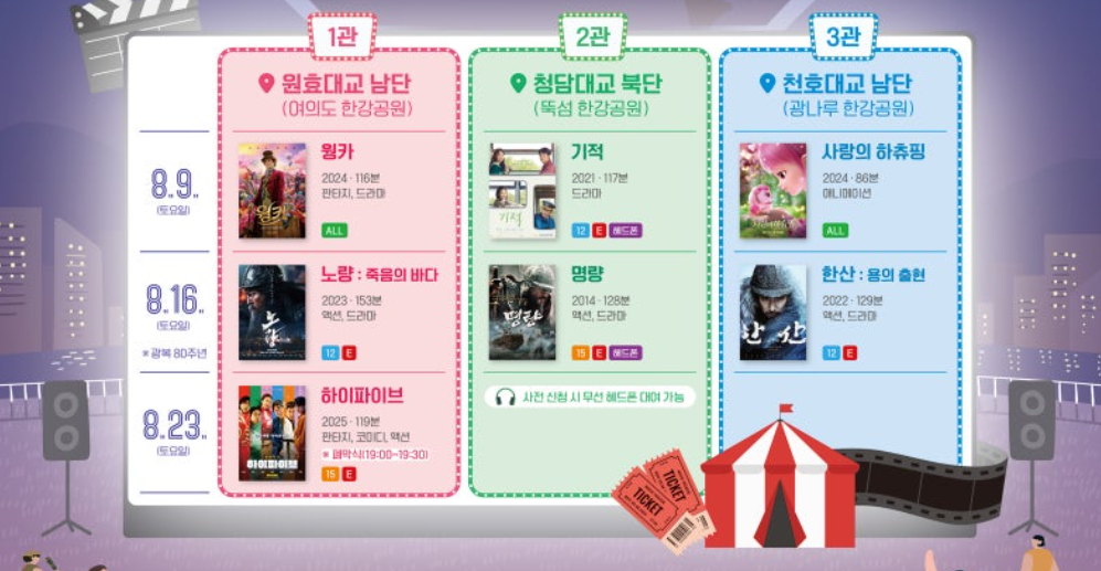 매년 여름, 서울시가 주최하는 한강페스티벌의 대표 프로그램 중 하나로, 여의도·광나루·뚝섬 다리 아래 야외 공간을 무대로 영화 상영 + 피크닉 세트가 결합된 문화 이벤트입니다. 정겹게 펼쳐지는 대형 스크린 아래 돗자리 깔고 영화 보는 감성, 도심 속 소소한 설렘이 가득하죠. 올해는 한강페스티벌 공식 홈페이지에 명시된 대로 이들 세 곳을 포함한 다양한 다리 밑 장소에서 매일 밤 20:00부터 영화 상영이 진행됩니다.