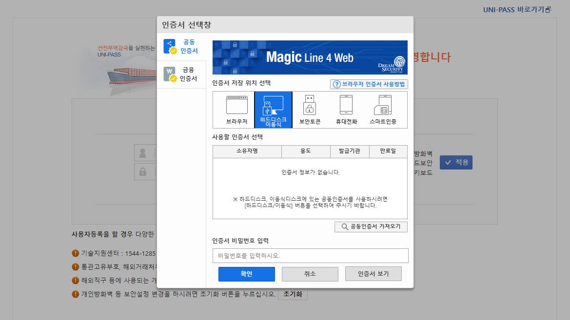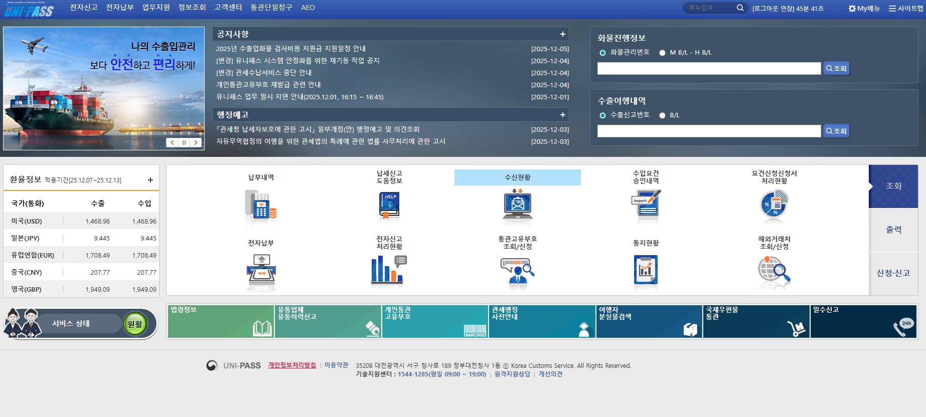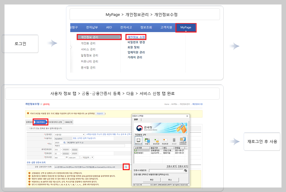 유니패스 홈페이지에 접속하세요. 링크를 클릭하면 바로 유니패스 관세청 홈페이지에 연결됩니다. 사전신고를 위해서는 공인인증서 로그인이 필요합니다. 회원가입을 완료한 후 공인인증서 로그인이 가능하도록 세팅하세요. 인증서 등록은 다음 절차를 따르면 됩니다. My Page > 개인정보관리 > 개인정보수정 >사용자 정보 탭> 공동 금융인증서 등록> 다음> 서비스 신청 탭 완료 > 재로그인 후 사용. 쉽게 보기 위해서는 아래 그림을 참고하세요. 인증서 등록은 업체대표 및 일반개인 사용자만 가능하며, 업체 직원은 인증서 등록이 불가합니다.