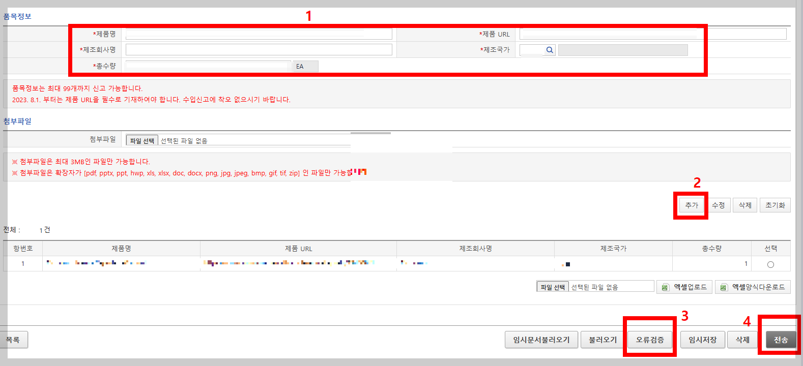 품목정보는 입력 후 하단에 추가 버튼을 반드시 눌러야 합니다. 추가 버튼을 누르면 아래 그림과 같이 항목이 생성됩니다. 사전신고 신청서를 전송하기 전 오류검증을 먼저 하세요. 오류 검증 버튼을 누릅니다. 오류가 발견되지 않았다는 안내창을 확인한 후 전송을 누르면 완료입니다.