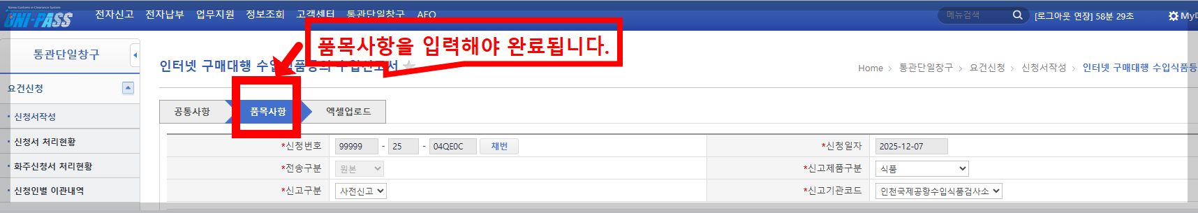 사업자가 입력한 정보는 모두 사전신고의 공통사항 항목에 해당했습니다. 사전신고는 품목사항도 입력해야 합니다. 임시 저장이 완료되었다면 스크롤을 위로 올려주세요. 품목사항을 클릭합니다.