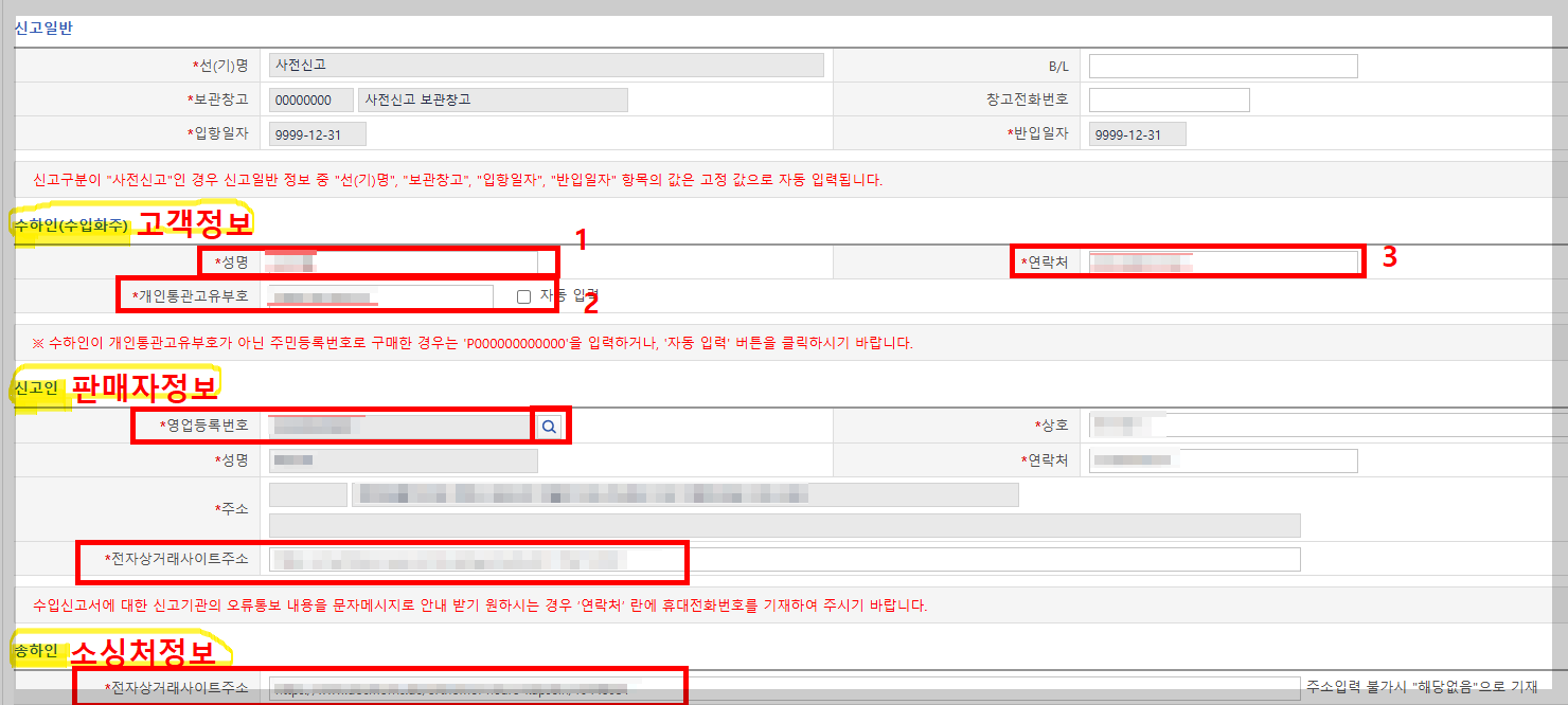 - 수하인(수입화주) : 고객 정보입니다. 입력란에는 *고객명과 *고객의 개인통관고유부호, * 고객의 연락처를 기재합니다.
