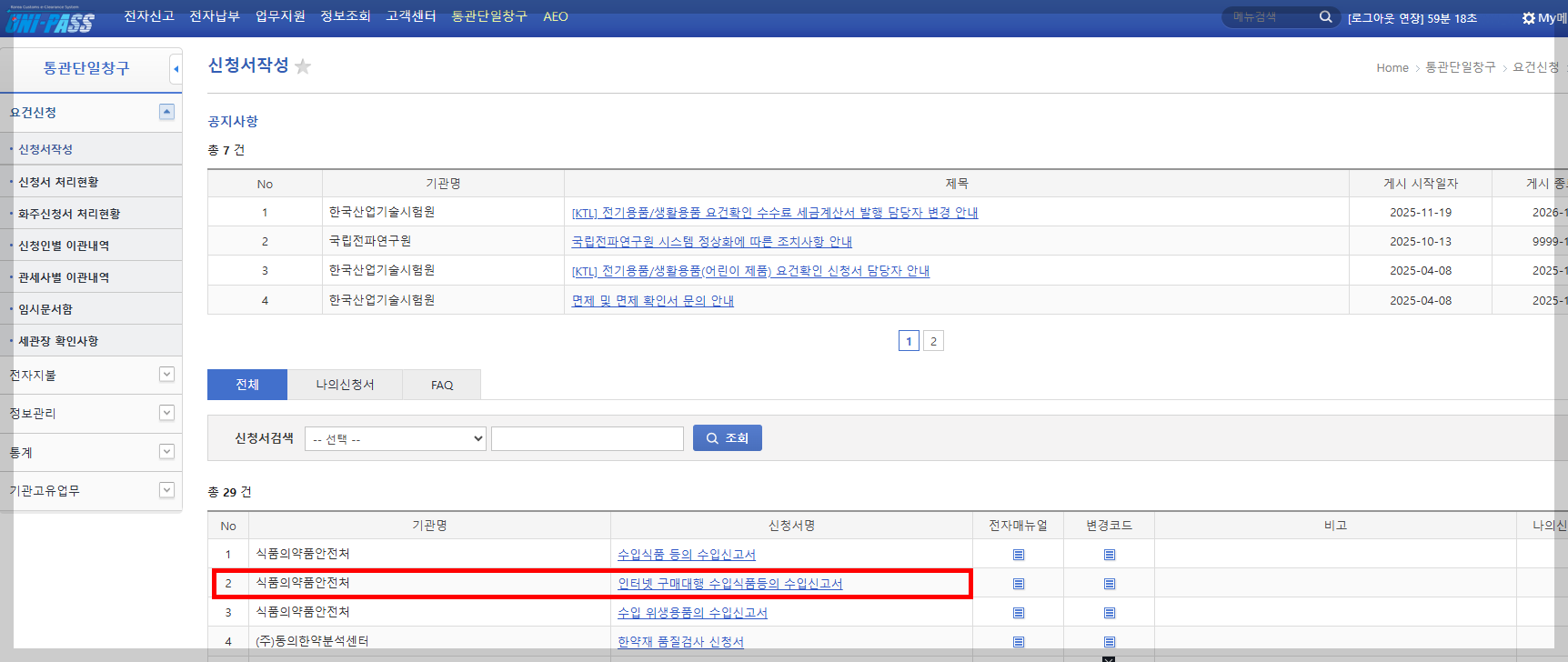 신청서 작성을 클릭한 후에는 신청서 목록이 나옵니다. 건강기능식품 사전신고는 인터넷 구매대행 수입식품등의 수입신고서를 클릭하면 됩니다. 기관명은 식품의약품안전처입니다.